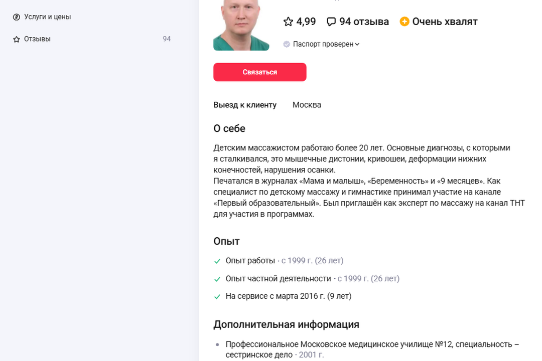 О каждом специалисте представлена подробная информация, начиная с цен на тот или иной вид услуг, заканчивая его образованием и опытом работы. Для уверенности - дают возможность просмотреть копии документов, подтверждающих специализацию мастера, например, дипломов, удостоверений и т. п. После того, как определилась с исполнителем, оставила свои контактные данные в специальной форме, минут через 20 мне уже перезвонили с целью подтверждения.